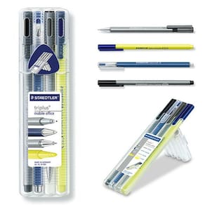Conjunto Staedtler Triplus Mobile Office 4 Peças Perfeito para o uso na escola ou no escritório. Maior qualidade em seus traços e anotações Ideal para presentear amantes da arte e executivos. Contem na Embalagem: 1 Caneta Triplus Fineliner 0,3mm na cor preta. 1 Lapiseira Triplus Micro 0.5mm 1 Marca texto fluorescente Triplus Textsurfer Amarelo 1 Caneta Triplus Ball M Azul