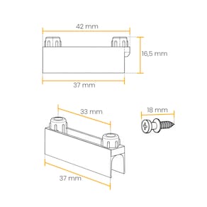 Medidas: • Comprimento: 37 mm • Largura: 42 mm • Altura: 16,5 mm • Distância entre eixos: 33 mm • Parafuso: 18 mm