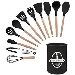 Conjunto Talheres de Silicone Madeira Kit 12 Peças Espátulas Cor: Preto Maravilhoso Kit / Jogo com 12 Peças de Madeira / Silicone