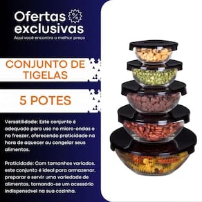 Kit com 5 Potes de Vidro - Conjunto de Tigelas Bowl para Mantimentos