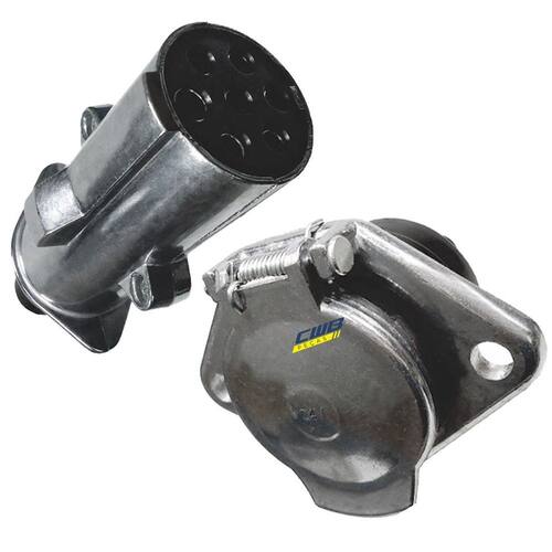 Tomada Elétrica para Engate Redonda 7 polos, Completa Alumínio Polido Conexão Fixa e Móvel; Bivolt 12/24V Utilizada em cavalo mecânico, reboques e semireboques, conexão fixa e móvel; Tomada de fino acabamento em alumínio polido; 7 polos, completa: macho e fêmea ; Possui gravação de norma DIN, numeração dos terminais; Dimensões Aproximadas: Fixa: 9,5 x 8,7 x 6,7 cm Móvel: 5,8 x 11,7 x 4,7 cm Marca: Não Informado