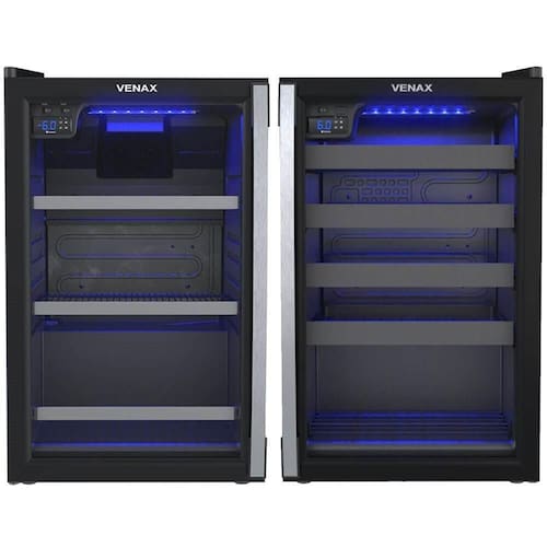 A cervejeira Venax tem capacidade para até 96 latas de 350 ml, 78 latas de 473 ml, 48 garrafas long neck de 355 ml, 34 garrafas de 600 ml ou 20 garrafas de 1 litro. Já a adega Piubella Cave comporta até 24 garrafas, com diâmetro máximo de 90 mm, distribuídas em 4 prateleiras deslizantes e 1 fixa.