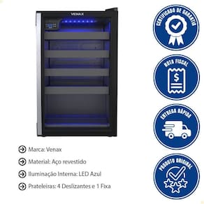 Tanto a cervejeira quanto a adega funcionam exclusivamente em 220V. É fundamental verificar se a rede elétrica do local é compatível antes da instalação, para garantir o funcionamento correto e evitar qualquer dano aos aparelhos. Modelo alfanumérico: 19920 + 7835 | É freezer: Não | Capacidade em volume: 82 L | Largura: 49,5 cm | Profundidade: 61 cm | Com controle de temperatura: Sim | Temperatura mínima: 0 | Temperatura máxima: 0 | É geladeira: Não | voltagem: 220V | Com luz interior: Sim | Altura: 80 cm | Orientação: Vertical | É cervejeira: Sim | É expositor: Sim | Peso Líquido: 0.0000 | Dias Entrega Fornecedor: 1 | EmbalagemAltura-cm: 170 | EmbalagemLargura-cm: 61 | Modelo: Não Informado | Marca: Venax | Cubagem: 0.539240 | EmbalagemComprimento-cm: 52