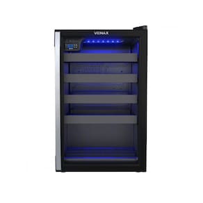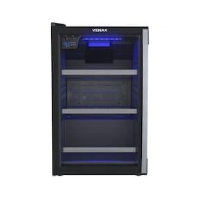 Conjunto Venax Cervejeira Blue Light 82L com porta invertida e Adega Piubella Cave para 24 garrafas. Controle digital de temperatura, iluminação interna em LED azul e sistema de refrigeração por compressor.Controle de temperatura