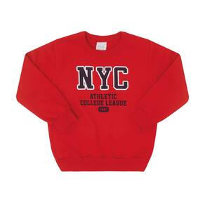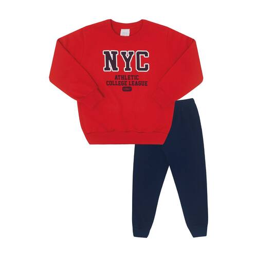 O conjunto colegial vai ser o favorito do seu pequeno fashionista. Confeccionado em moletom, o blusão na cor vermelho possuí elastano na barra e nos punhos, garantindo conforto e bom caimento da peça, o detalhe destaque do blusão é a sua estampa em puff com o letreito NYC - Liga atlética da faculdade. Seu pequeno fashionista irá adorar se sentir um galã estudante. A calça na cor marinho vai garantir conforto durante o dia. \n