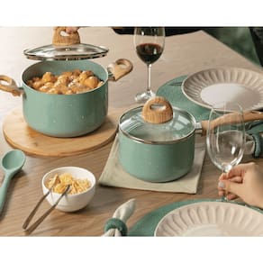 As panelas contam com revestimento Pro Ceramic Premium antiaderente Mineral Resist, o que torna o preparo de pratos mais saudável, pois cozinha com menos óleo, e a limpeza mais prática. A colher e a espátula em silicone não são abrasivas, suportam altas temperaturas e impedem o acúmulo de bactérias.Além de saudável, esse conjunto de panelas é sustentável e integra o Projeto Green Planet Brinox. O alumínio da estrutura das panelas, que aquece os alimentos de maneira uniforme e acelera o processo de cocção, é 98% proveniente de materiais reciclados.O Conjunto de Panelas 6 Peças Botanika é composto por 1 Caçarola com Tampa Ø 22 x 10,5 cm - 3,55 L; 1 Panela com Tampa Ø 20 x 9,5 cm - 2,55 L; 1 Panela com Tampa Ø 18 x 9 cm - 1,55 L; 1 Frigideira Ø 22 x 4,5 cm - 1,1 L; 1 Espátula de silicone 28 x 5,3 cm; e 1 Colher para Arroz de silicone 28 x 5,9 cm.A cor Verde deste conjunto traz sofisticação e cabos/alças são em baquelite soft-touch de efeito amadeirado. As tampas, em vidro temperado, têm saída para o vapor.O conjunto de panelas ainda conta com a certificação PFOA free, isto é, são itens livres de liberação de toxinas. Produtos de alta durabilidade, que ao final do ciclo ainda podem retornar para se tornar um novo produto, pois o alumínio das panelas é 100% reciclável. A embalagem é 100% biodegradável.Sustentabilidade é uma das marcas do Grupo Brinox, que agora incorpora novas linhas de produtos às ações de cuidado com o meio ambiente nos seus processos produtivos. O Projeto Green Planet Brinox traz produtos produzidos com os mais altos padrões tecnológicos, agregando responsabilidade ambiental e sofisticação. Acesse o site e conheça nossa linha completa de produtos.