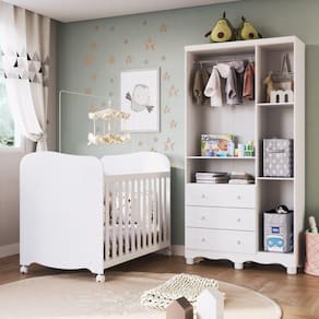 Desenvolvidos em 100% MDF e pintura atóxica, são produtos que oferencem maior segurança para toda a família. O guarda roupas possui portas com janelas em PETG cristal, corrediças e cabideiros metálicos. Também acompanha 2 modelos de rodapés (1 reto e 1 torneado - usinado), para que você escolha qual utilizar no momento da montagem. E o berço também conta com muitos benefícios e qualidades. Ele possui estrado móvel com 3 regulagens de altura, 4 rodízios sendo 2 com travas, grades fixa e claro, registro no INMETRO (001950/2019). O colchão indicado é de 70 x 130 (largura x comprimento). Tudo para que você e sua família tenham conforto e tranquilidade com a maior segurança. Altura do Conjunto: 188.5 Ambiente Principal: Quarto de Bebê Certificado: 001950/2019 Complexidade da Montagem: Alta: deve ser montado por um montador especializado Cor: Branco Brilho Cor do Produto: Branco Brilho Escala de Brilho: Brilhante Informações Complementares: Acompanha 2 rodapés de montegem opcional, 1 reto e 1 torneado (usinado). Fundo em HDF 3mm. Possui sistema antitombamento para maior segurança. Linha ou Coleção: Mimo Manual de Especificação Técnica: Manual de Montagem e Instalação: https://cdn2.madeiramadeira.com.br/atributo/moveis-peroba/1094298-gr-3p-ber.pdf Material Principal: MDF Medida de Cada Item: Guarda Roupa: 188,5 x 91,9 x 41,5 (AxLxP - cm) Berço: 98,6 x 132,4 x 76 (AxLxP - cm) Necessita Montagem: Sim Origem do Produto: Nacional Peso: Guarda Roupa: 55,33kg Berço: 30,9kg Pintura Atóxica: Sim Recomendações de Uso, Manutenção e Limpeza: Para limpeza utilizar somente pano limpo e macio, ligeiramente umedecido em água (apenas o bastante para remover a poeira), seguido de um pano seco. Sistema de Montagem: Parafusos autoatarraxantes, conjuntos minifix, cavilhas de madeira, acessórios plásticos e metálicos. Suporta Até (kg): Guarda Roupas: 60kg Berço: 40kg