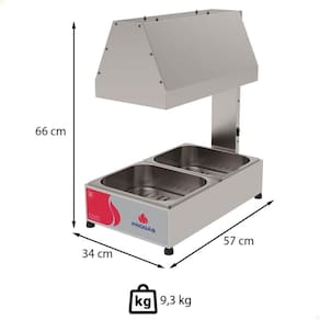 - Equipado com lâmpada infrared de 250W, cuba inox GN 1/2? e interruptor com proteção de silicone antirrespingos, ele assegura que o excesso de óleo seja escorrido adequadamente, mantendo a temperatura ideal para suas frituras.