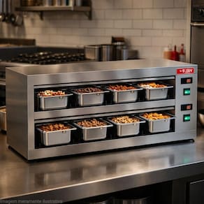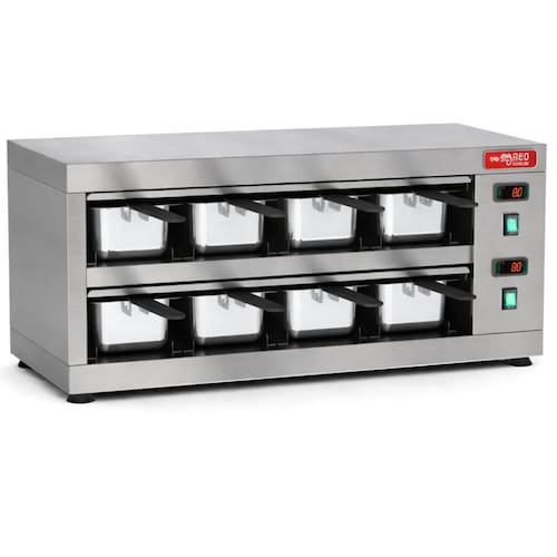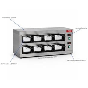 Características Técnicas: Material estrutural: Aço Acabamento: Pintura de alta resistência Uso indicado: Pré-preparo e conservação de proteínas Aplicação: Restaurantes, cozinhas comerciais, açougues e lanchonetes Pés com regulagem de altura, facilitando a instalação e nivelamento do equipamento Regulagem de temperatura: de 50C a 100C Temperatura trabalho: recomendado 65C Modelo: COPROH8 Com 8 cubas 1/3 100mm Limpeza: Bandejas removíveis Potência: 800W