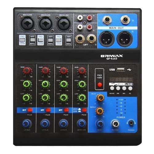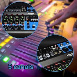 Mesa de som Profissional completa para quem ama mixes, essa espetacular mesa de som, Possui conexão via Bluetooth, Usb é Bivolt e possui entradas para microfones, além de conter 1 efeito delay São 3 canais para microfones e instrumentos, modo de gravação RCA e a mesa também possui Power 48v 1 canal PC nao precisa de sowfter parar grava direto no driver com windows e 1 Canal usb Pendrive Tem Efeitos de Delay , 3 bandas de equalização, saídas XLR, P10 e RCA para conexões de microfone e um Processador de 16 efeitos incrível. Características: 5 Canais: canais de entrada mono com XLR banhado a ouro e entradas de linha balanceada. Pré-amplificadores discretos de ruído ultrabaixo com power de + 48v Equalizador ultra musical de 2 bandas em todos os canais Configuração de fader: 4 + 1 Master Funções: USB MP3 e Bluetooth Processador de efeitos Efeitos: Delay e Repeat Power: +48V Alimentação: cabo Tipo C Dimensões: 20,5cm x 20,5cm x 7cm P x L x A Equalização: 3 bandas Low: 15/+80 50Hz Hi: 15/+12 10kHz Entrada Mic: Frequência de Resposta: 10Hz200kHz Faixa de Ganho: +14dB+60dB SNR: 120dB Entrada Line: Frequência de Resposta: 10Hz70kHz Faixa de Ganho: 6dB+38dB SNR: 95dB Canais Estéreo Frequência de Resposta: 10Hz70kHz Entradas e Saídas: 03 Entradas Mic/Line 01 Entrada USB 02 Entradas RCAs de áudio estéreo 02 Saídas XLR Main Out 02 Saídas P10 Main Out 01 Saídas de Fone de Ouvido p2 - 200Ohms/300mW 02 Saídas RCAs de Áudio Estéreo Para Gravação Itens Inclusos: 01 Mesa de Som 01 cabo tipo C 01 cabo MD9 para PC 01 manual em português Homologação Anatel: 080281811799 Marca: Não Informado