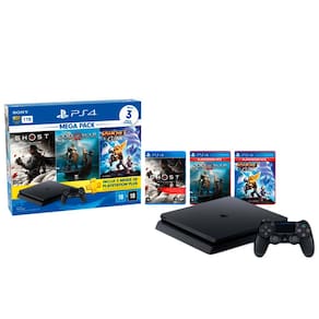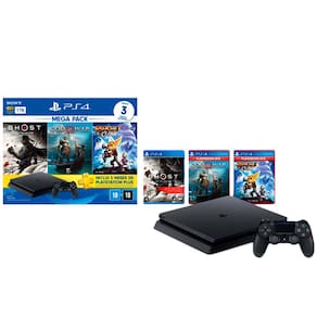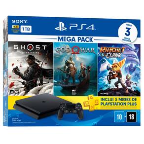 O Mega Pack é o melhor pacote de entretenimento, com 3 jogos fantásticos para o PlayStation: Ghost of Tsushima, God of War e Ratchet & Clank, além de um voucher para PlayStation Plus de 3 meses.