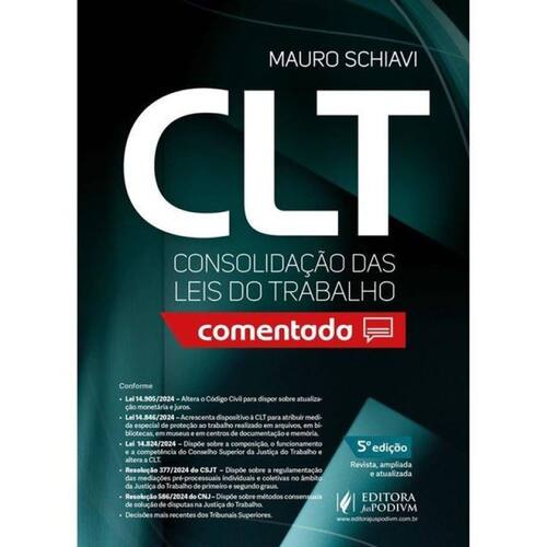 CONFORME: • Lei 14.905/2024 – Altera o Código Civil para dispor sobre atualização monetária e juros. • Lei 14.846/2024 – Acrescenta dispositivo à CLT para atribuir medida especial de proteção ao trabalho realizado em arquivos, em bibliotecas, em museus e em centros de documentação e memória. • Lei 14.824/2024 – Dispõe sobre a composição, o funcionamento e a competência do Conselho Superior da Justiça do Trabalho e altera a CLT. • Resolução 377/2024 do CSJT – Dispõe sobre a regulamentação das mediações pré-processuais individuais e coletivas no âmbito da Justiça do Trabalho de primeiro e segundo graus. • Resolução 586/2024 do CNJ – Dispõe sobre métodos consensuais de solução de disputas na Justiça do Trabalho. • Decisões mais recentes dos Tribunais Superiores. POR QUE ESCOLHER O LIVRO “CONSOLIDAÇÃO DAS LEIS DO TRABALHO COMENTADA”? O rápido esgotamento da quarta edição desta CLT Comentada, bem como as manifestações positivas dos leitores e leitoras desta obra motivaram-me a atualizá-la e a ampliá-la, tendo por objetivo apresentar ao seleto público leitor as informações mais relevantes e úteis sobre cada dispositivo da CLT, facilitando sua interpretação e aplicação, tanto ao acadêmico como ao profissional, mas, também, aos que se preparam para os concorridos concursos na área trabalhista, especialmente Magistratura e Ministério Público do Trabalho. Espero que a obra continue sendo útil a todos os que a consultarem. O Autor Marca: Não Informado