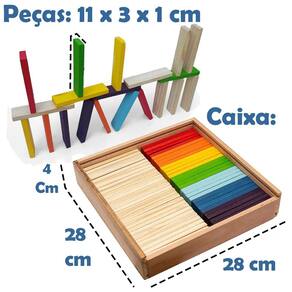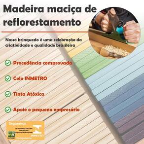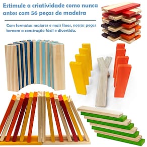 Placas confeccionadas artesanalmente em madeira maciça de reflorestamento e pintadas com tinta atóxica. Possibilidade de equilibrar e montar em outros formatos, incentivando a criatividade e imaginação. Espessura da peça ideal para permitir um ótimo equilíbrio do brinquedo e inúmeras brincadeiras. Caixa com 56 placas.