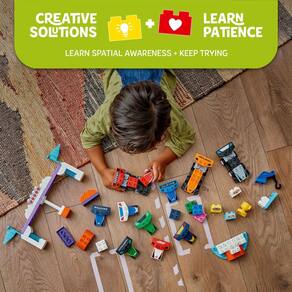 - LEGO Carros de brinquedo F1 – Este modelo montável para crianças pequenas pode ser construído com a ajuda dos pais e inclui 10 carros de corrida montáveis, 3 blocos de motorista, um brinquedo de guindaste, luzes de partida e um pódio