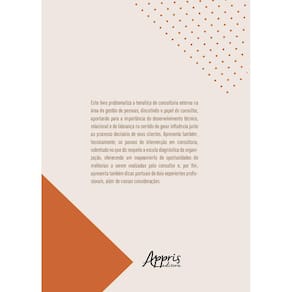 Este livro problematiza a temática de consultoria externa naárea de gestão de pessoas, discutindo o papel do consultor,apontando para a importância do desenvolvimento técnico,relacional e de liderança no sentido de gerar influência juntoao processo decisório de seus clientes. Apresenta também,tecnicamente, os passos de intervenção em consultoria,sobretudo no que diz respeito a escuta diagnóstica da organização,oferecendo um mapeamento de oportunidades demelhorias a serem realizadas pelo consultor e, por fim,apresenta também dicas pontuais de dois experientes profissionais,além de nossas considerações.