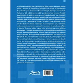 A presente obra analisa, sob a perspectiva da Saúde Coletiva, e à luz das Ciências Sociais e Humanas, as competências preconizadas às equipes de Consultório na Rua, adotadas pelo Ministério da Saúde na Atenção Básica por intermédio da Portaria n.º 122, de 25 de janeiro de 2011, tendo como base um curso oferecido pelo Ministério da Saúde em parceria com a Fundação Oswaldo Cruz (FIOCRUZ). Para tanto, utiliza o material didático de qualificação profissional dessas equipes, abordado nesse curso, observando a relevância de temas ali propostos que se coadunem com a efetividade do cuidado e do direito à saúde relativos às pessoas em situação de rua. Pessoas em situação de rua são pessoas que, por distintos motivos, passaram a morar na rua e, assim, necessitam de cuidados específicos. O Sistema Único de Saúde, regido pelos princípios da universalidade, integralidade e equidade, almeja a redução das desigualdades em saúde e busca atender às especificidades dessas pessoas, apesar de todos os percalços que lhes são impostos. Após a implantação da Política Nacional para População em Situação de Rua, avanços foram conquistados. Contudo, um longo percurso se faz necessário, principalmente pelo fato de que o número de pessoas em situação de rua tem aumentado ano após ano, tornando- se necessário pensar em um trabalho a ser efetuado pelas referidas equipes que possibilite a saúde dessa população nos moldes preconizados pelo mencionado sistema de saúde. Esta pesquisa, de cunho qualitativo, utilizou dois métodos para coleta de dados: o primeiro, a análise documental da formação de profissionais das equipes de Consultório na Rua; e, o segundo, a observação de eventos públicos sobre população em situação de rua. Os resultados apontam a importância da construção de novas possibilidades de processo de formação em saúde relativas aos profissionais envolvidos, que requer saberes e práticas que consubstanciem um sistema de saúde mais comprometido com a saúde e as necessidades de pessoas em situação de rua.