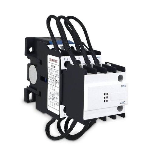 Os contatores para Capacitor linha CC SIBRATEC foram desenvolvidos para acionamento de capacitores utilizados na correção de fator de potência. Projetados de acordo com a norma IEC 60947-4. Os contatores CC possuem resistores de pré-carga, quais tem a função de limitar as correntes de in-rush gerada quando os capacitores são acionados. Esses resistores estão conectado a um bloco de contatos adiantados que fica na parte superior do contatores. Quando acionado o contator, esses contatos adiantados são conectados antes que os contatos principais. Quando os contatos principais fecham, esses contatos adiantados são abertos, ficando apenas o capacitor ligado a rede.