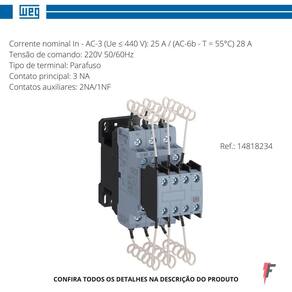 Características técnicas: Modelo: cwbc25-21-30d23 Referência: 14818234 Corrente nominal: 25a Contato auxiliar: 2na e 1nf Tensão de comando: 220v Tipo de terminal: parafuso Ean: 7909522824053