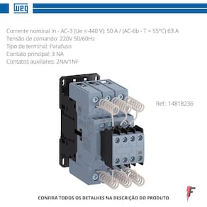 Características técnicas: Modelo: cwbc50-21-30d23 Referência: 14818236 Corrente nominal: 50a Contato auxiliar: 2na e 1nf Tensão de comando: 220v Tipo de terminal: parafuso Ean: 7909522824084
