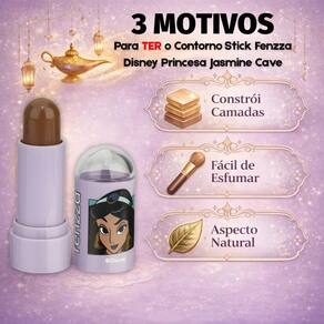 Aplique o Contorno Stick Fenzza Disney Princesa Jasmine Dis109 diretamente nas áreas que deseja contornar, como abaixo das maçãs do rosto, nas laterais do nariz e na linha do maxilar.