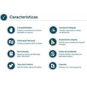 Estanqueidade Teste de vedação Neste teste, submete-se o equipamento à uma pressão hidrostática água sob pressão constante por um período de tempo em conformidade com as normas da Associação Brasileira de Normas Técnicas ABNT que, dependendo do produto testado, pode variar de 40 a 150 metros coluna d'água M.C.A. . Ao término do tempo especificado na norma, o equipamento testado não deve apresentar nenhum vazamento Ean: 7898550254768
