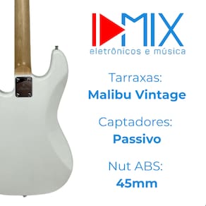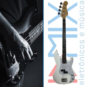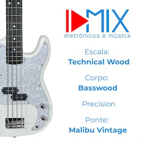 Formato do Corpo: Precision Corpo: Basswood Braço: Maple – Shape C Escala: Technical Wood Construção: Junção Parafusada Tensor: Dupla Ação Número de Trastes: 21 Número de Cordas: 4 Nut: ABS – 45mm Captadores: Malibu Passivo Controle: 01 Volume e 01 Tonalidade Escudo: Sanduiche Branco Perolado Tarraxas: Malibu Vintage Ponte: Malibu Vintage Jack: P10 Utilização/Mão: Destro