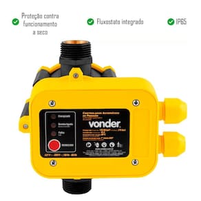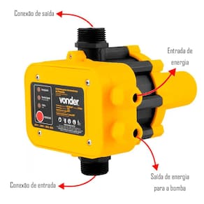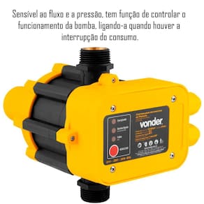 Indicado como controlador eletrônico, sensível ao fluxo e a pressão, tem função de controlar o funcionamento da bomba, ligando-a quando houver consumo de água e desligando-a quando houver a interrupção do consumo.