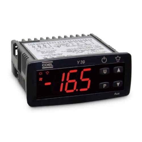 Descrição do produto: Controlador para refrigeração congeladosO modelo y39 foi desenvolvido para aplicações em refrigeração com controle de temperatura on/off e controle de degelo por intervalo de tempos mediante parada do compressor, aquecimento elétrico ou gás quente com inversão de ciclo. O instrumento possui 3 saídas a relé e 3 entradas para sondas ntc, com a possibilidade de 1 entrada ser configurada como entrada digital. As 3 saídas podem ser configuradas para comando do compressor, degelo, ventilador, saída auxiliar ou alarme. As 3 entradas para sondas de temperatura são utilizadas para controle da temperatura ambiente, para monitorar a temperatura do evaporador e para medir uma temperatura auxiliar (exemplo: temperatura do produto). A entrada 2 ou 3 pode ser configurada como entrada digital e executar algumas funções como: sinalização de porta aberta, comando de degelo, seleção do Set Point de controle, sinalização de alarme externo, ativação do ciclo continuo, ativação da saída auxiliar.Caracteristicas:Alimentação: 100 a 240 vca,Display vermelho,2 entradas para sensor ntc (ambiente + evaporador)1 entrada digital (esta entrada pode ser configurada como 3º sensor)3 saídas relé Qualquer saída pode ser configurada como compressor, degelo, ventilador, alarme ou auxiliarDegelo elétrico, por inversão de gás ou dinâmico (que proporciona economia de energia)Certificação ul e ce.Aplicações:AdegasBalcões frigoríficosFreezersFreezers verticaisIlhas refrigeradas.