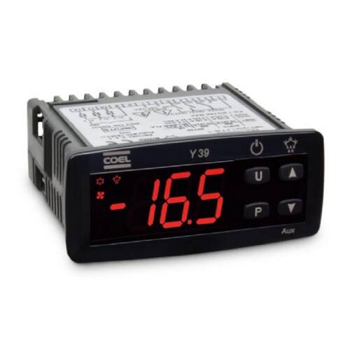 O modelo y39 foi desenvolvido para aplicações em refrigeração com controle de temperatura on/off e controle de degelo por intervalo de tempos mediante parada do compressor, aquecimento elétrico ou gás quente com inversão de ciclo. O instrumento possui 3 saídas a relé e 3 entradas para sondas ntc, com a possibilidade de 1 entrada ser configurada como entrada digital. As 3 saídas podem ser configuradas para comando do compressor, degelo, ventilador, saída auxiliar ou alarme. As 3 entradas para sondas de temperatura são utilizadas para controle da temperatura ambiente, para monitorar a temperatura do evaporador e para medir uma temperatura auxiliar exemplo: temperatura do produto . A entrada 2 ou 3 pode ser configurada como entrada digital e executar algumas funções como: sinalização de porta aberta, comando de degelo, seleção do Set Point de controle, sinalização de alarme externo, ativação do ciclo continuo, ativação da saída auxiliar.