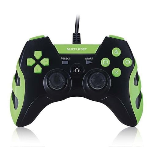 - Especificações técnicas: • Marca: Multilaser • Modelo: JS091 • Cor: Preto/Verde • Composição do material: ABS • Função Dual Shock: Sim • Analógico com LED: Sim • Direcional: Placas internas reforçadas com silicone para maior vida útil • Gatilhos: Alta sensibilidade para aumentar a velocidade de resposta • Superfície emborrachada: Sim • Compatível com: PS3 e PC, Windows 7 / 8 / 10 • Dimensões aproximadas: 15,5 x 10,5 x 6 cm • Peso: 280g
