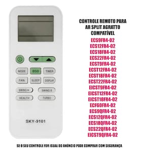 Controle remoto para ar agratto eicst18fr4-02 compatível Feito em plástico pvc resistente, com teclas emborrachadas e aderentes. Não gaste seu dinheiro com controles de qualidade duvidosa. Possui as mesmas características, botões e funções do . Não necessita programar, basta colocar as pilhas e usar, fácil e prático. - este produto é compatível com a marca e o modelo do anúncio. - fabricante: mbtech vc / wlw. - é alimentado por duas pilhas aa, que não são inclusas. - alguns modelos compatíveis: Ecs9fr4-02 Ecs12fr4-02 Ecs18fr4-02 Ecs22fr4-02 Ecst9fr4-02 Ecst12fr4-02 Ecst18fr4-02 Ecst22fr4-02 Eicst9fr4-02 Eicst12fr4-02 Eicst18fr4-02 Ecf60fr4-02 Ecs9qfr4-02 Ecs12qfr4-02 Ecs18qfr4-02 Ecs22qfr4-02 Eicst9qfr4-02 Eicst12qfr4-02 Eicst18qfr4-02