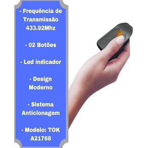 - Modelo: TOK 433,92 - A21768 - Alça de fixação reforçada - Botões acoplados ao corpo - Nova fixação da bateria - Circuito eletrônico produzido com componentes SMD - Resistente a impactos e quedas - Disponível nas frequências 433,92 MHz - Dimensões: A 80 mm x L 38 mm x P 35 mm