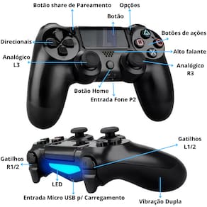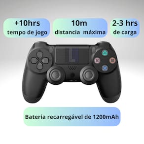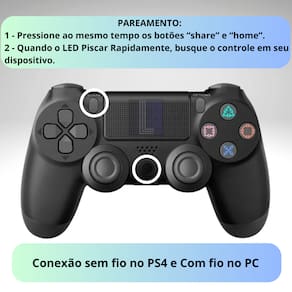 Controle Sem Fio para PS4 e com cabo para usar no PC .Prepare-se para uma jornada épica com o Controle Sem Fio PS4 Dualshock. Este dispositivo, repleto de recursos avançados, oferece desempenho excepcional, conforto supremo e versatilidade incomparável.Recursos Imersivos para Jogabilidade Intensa:Vibração Dupla: Sinta cada impacto, explosão e movimento com a vibração dupla, mergulhando você no mundo do jogo.Touch Sensível: Explore um novo nível de controle com a função de toque integrada. Gestos precisos e intuitivos tornam sua jogabilidade ainda mais envolvente.Estabilidade Garantida: Execute comandos com precisão absoluta. A jogabilidade estável e responsiva é essencial para dominar qualquer desafio.Botão Share: Compartilhe seus momentos épicos com o mundo. Capture e compartilhe instantaneamente suas jogadas incríveis.Conectividade Versátil e Compatibilidade Total:Áudio Imersivo e Conexão para Fone de Ouvido: Ouça cada detalhe do jogo com o alto-falante integrado e conecte seu fone de ouvido para uma experiência auditiva envolvente.Sensores de Aceleração 3D e Função Sixaxis: Controles de movimento precisos e intuitivos tornam a jogabilidade dinâmica e realista.Compatibilidade: Este controle funciona com todas as versões Para PS4 e também pode ser facilmente conectado ao seu PC através do cabo.Conexão Bluetooth e Recarregável: Livre-se dos cabos com a conexão Bluetooth.Além disso, a bateria recarregável garante que você nunca fique sem energia no meio de uma partida intensa.Conteúdo da Embalagem:1x Controle Sem Fio1x Cabo USB para Carregamento