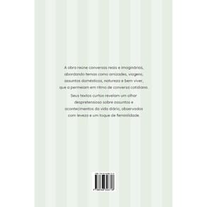 Sinopse do livro: A obra reúne conversas reais e imaginárias, abordando temas como amizades, viagens, assuntos domésticos, natureza e bem viver, que a permeiam em ritmo de conversa cotidiana.