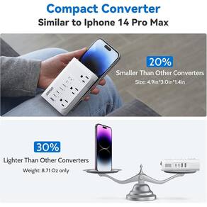 - [52% mais conversor de energia para a maioria dos itens essenciais de viagem] Em comparação com conversores padrão de 230 W, nosso transformador de 350 W alimenta 30% mais dispositivos: laptops, tablets, Xbox, máquinas CPAP, nebulizadores, bombas de leite e até mesmo ferramentas de cabelo de 500 W (alisadores/modeladores). Observação: exclui secadores de cabelo, chaleiras.