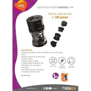 Conversor de tomadas padrão universal preto oex cp100 Conversor de padrões universal: bivolt / pode ser utilizado em mais de 150 países / padrões europeu, americano, chinês, entre outros / potência máxima: 1500w / tensão/corrente: ac 85-260v 13a / dimensões: 4,8 x 4,8 x 8,5cm / peso: 90g