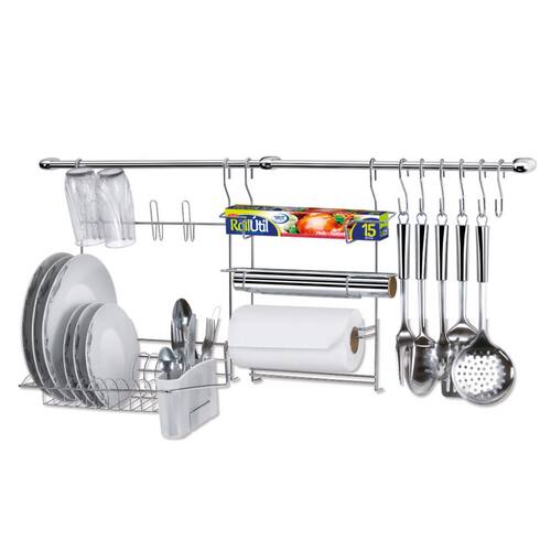 Cook Home 9 Arthi (Comprimento 100 cm) - Máxima Organização Suspensa O Cook Home 9 da Arthi é um sistema de organização de parede de grande porte, projetado para cozinhas que necessitam de máxima otimização vertical. Ele combina duas barras para criar um espaço de trabalho suspenso, mantendo utensílios, papel e louças acessíveis. Características Físicas e Funcionais: Design Suspenso: Utiliza o espaço da parede para liberar a bancada, otimizando a área de preparo de alimentos. Componentes do Kit: O conjunto completo é composto por:2 barras de 49 cm (montadas lado a lado, totalizando 100 cm de área útil). 6 ganchos para pendurar utensílios diversos. 1 porta rolos (para papel toalha, filme ou alumínio). 1 escorredor (ideal para pratos, copos, ou talheres). Instalação Completa: Acompanha kit de fixação (buchas e parafusos) para montagem segura e permanente na parede. Material Premium: Fabricado em Aço Cromado, garantindo resistência à umidade, durabilidade e um acabamento estético sofisticado. Marca: Arthi. Especificações Técnicas: Comprimento Total Montado: 100 cm Dimensões (Instalado): Comprimento 100 X Largura 28 X Altura 47,5 cm Material: Aço Cromado