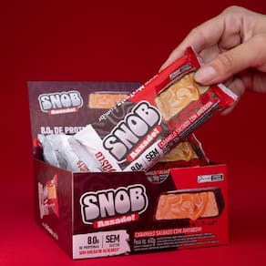 Descrição: Snob é a primeira barrinha de proteína assada ela é sem glúten, zero açúcar e com 9g de proteínas por barra.