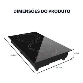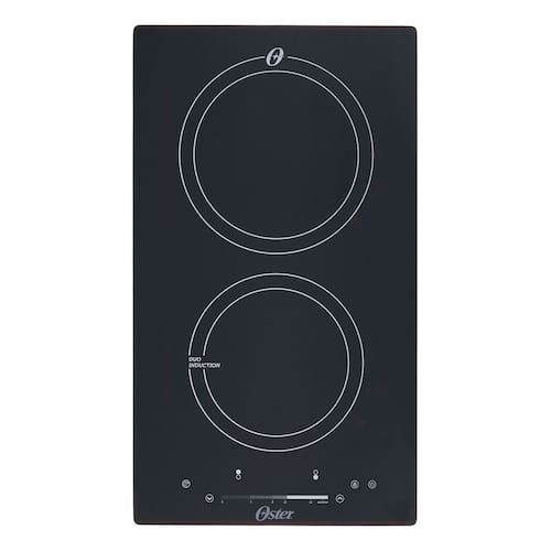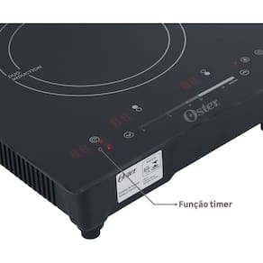 Cooktop de Indução Oster com 2 bocas, painel touch screen com controle slide, 14 níveis de potência, função Booster, timer até 99 minutos, trava de segurança e superfície em vidro cerâmico.Luz de calor residual