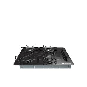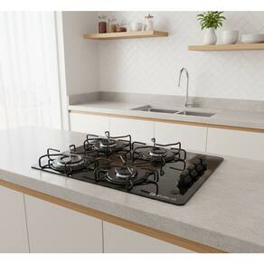 Cooktop Braslar Pop 4 bocas a gás com acendimento automático, design em vidro temperado preto ébano, queimadores potentes e trempes esmaltadas individuais.Alimentação