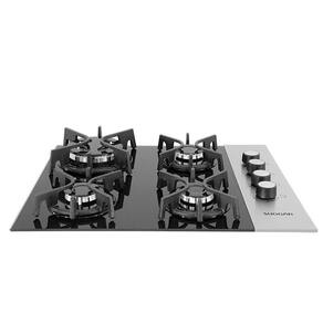 4 queimadores a gás com trempes duplas em ferro fundido e mesa em vidro temperado com frame inox.Luz de calor residual