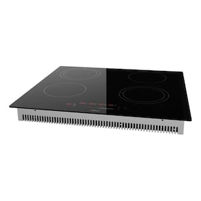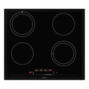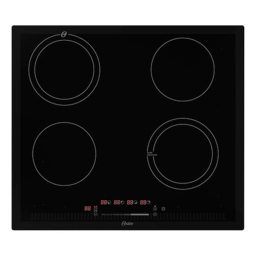 Cooktop de Indução Oster com 4 bocas, painel touch, 9 níveis de potência, função de bloqueio de segurança e superfície de vidro preto.Luz de calor residual