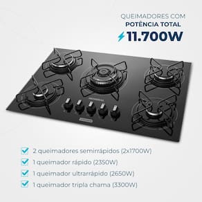 Características: Marca: Mondial Modelo: CTG-03 Linha: Cozinha Quantidade de Bocas: 5 Bocas Tipo de Acendimento: Automático Potência Total: 11.700W Tipo de Chama: 1 queimador tripla chama (3300W), 1 queimador ultrarrápido (2650W), 1 queimador rápido (2350W) e 2 queimadores semirrápidos (2x1700W). Tipo de Cooktop: Elétrico Tipo de Mesa: Vidro Código da Certificação INMETRO: BRA 20/00163