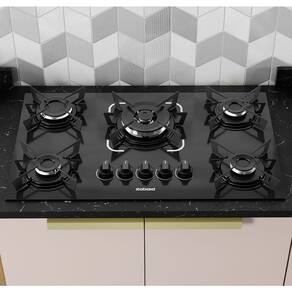 Cooktop Itatiaia Electra Glass com 5 bocas, queimador tripla chama, acendimento superautomático, mesa de vidro temperado e trempes individuais.Alimentação