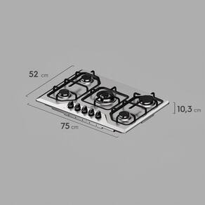 Descubra a arte de cozinhar com o Cooktop 5 bocas a Gas da linha Experience da Electrolux. Com design robusto e sofisticado, este cooktop possui tonalidade prata e e construido em metal resistente, conferindo durabilidade e elegancia para a sua cozinha. Com dimensoes de 75x52 cm (Largura x Profundidade), ele se encaixa perfeitamente em nichos de 69.5 cm de largura e 48 cm de profundidade. O peso do produto e de 10 kg, e mesmo nao sendo portatil, sua instalacao e pratica e descomplicada.