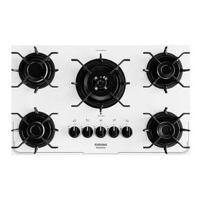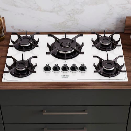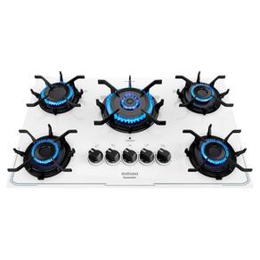Cooktop Itatiaia Itamaster com 5 bocas, tripla chama e acendimento superautomático. Mesa em vidro temperado e trempes individuais em ferro fundido.Alimentação