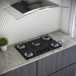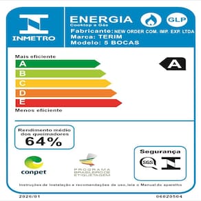 Acendimento: seletor automático -pressione e gire-. Trempes: aramadas esmaltadas -pretas-, anti-rotacao e com 6 apoios. Manipulos: plasticos pretos removiveis -facil limpeza-. Mesa de Vidro temperado: de 6 mm. Tipo de gas: GLP -botijao-. Certificacao Conpet A.Luz de calor residual