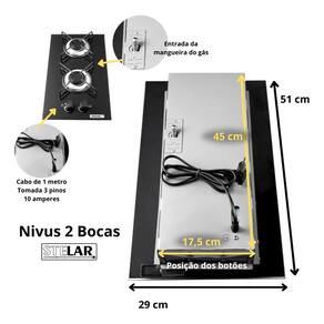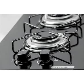 Especificações Técnicas Marca: Stelar Modelo: Nivus 2 Bocas Tipo: Cooktop de Mesa Portátil Número de Queimadores: 2 semi-rápidos Potência dos Queimadores: 1700 W cada Acendimento: Superautomático (Snap-In) Material da Mesa: Vidro temperado 6 mm Material das Trempes: Aço esmaltado em barra redonda Cor: Preto Tensão: Bivolt Tipo de Gás: GLP (botijão) Conversão para GN: Possível com kit de conversão (não incluso)