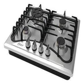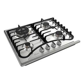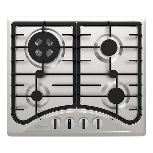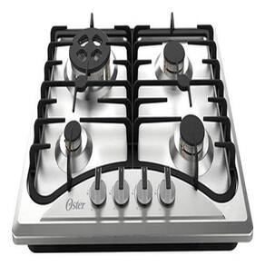 Cooktop a Gás Oster semiprofissional com mesa de inox, trempes de ferro fundido, queimadores italianos de alta eficiência e sistema Flameout Safety Protection.Luz de calor residual