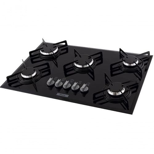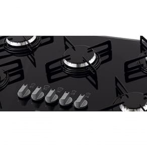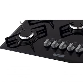 Cooktop a Gás Philco Cook Chef com 5 queimadores, sendo 2 rápidos (3000W) e 3 semirrápidos (1750W). Trempes em aço esmaltado, tampo em vidro temperado 8mm com acabamento bisotê e acendimento superautomático.Alimentação